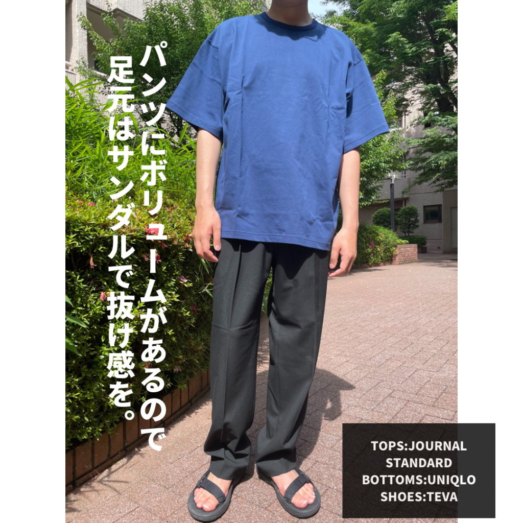 シンプルにTシャツを合わせたコーデ。ストンと落ちる素材でセンタープレスも入っているので、綺麗めな印象に!ラインも拾わないので、足が綺麗に長く見えます。トップスをタックインしてもかっこいいですが、素材がしっかりしたTシャツだったので、アウトで合わせてみました。夏はサンダルで合わせると抜け感が出て良いですね!