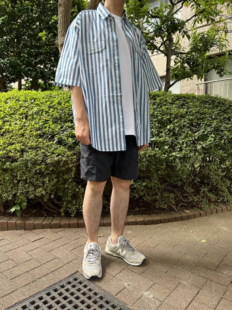ストライプシャツを使ったコーデ。オーバーサイズのシャツを羽織ることで、ショーツとのバランスバッチリです!Tシャツだけだと物足りない、カジュアルすぎるな〜という時は、シャツを合わせると少しキレイめなコーデになりますね!夏の街デートにピッタリだと思います!