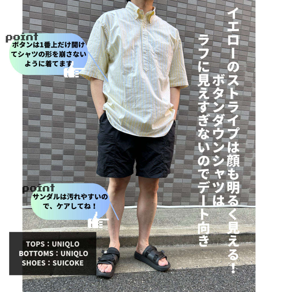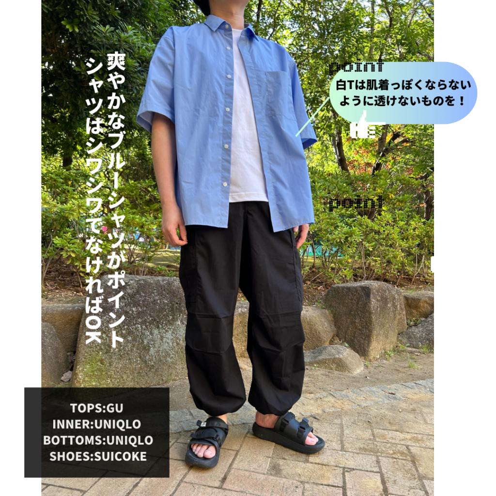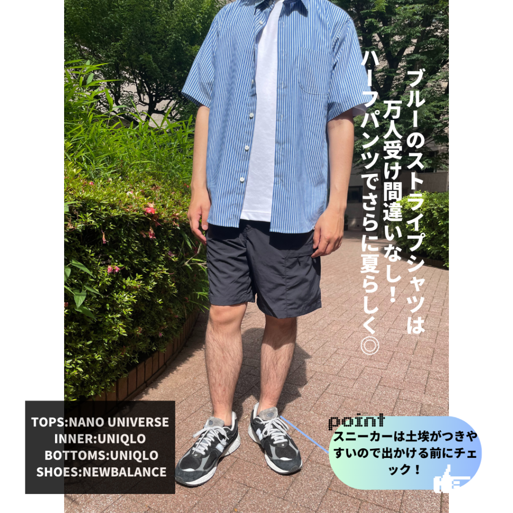 最後に「涼しげな素材感を選ぶ」です。夏は特に汗をかくので、季節感のない服装だと野暮ったく清潔感があるという状態からは離れてしまいます。リネン素材やコットンなどを選ぶと季節感もあり、軽やかな印象も出るので、おすすめです!